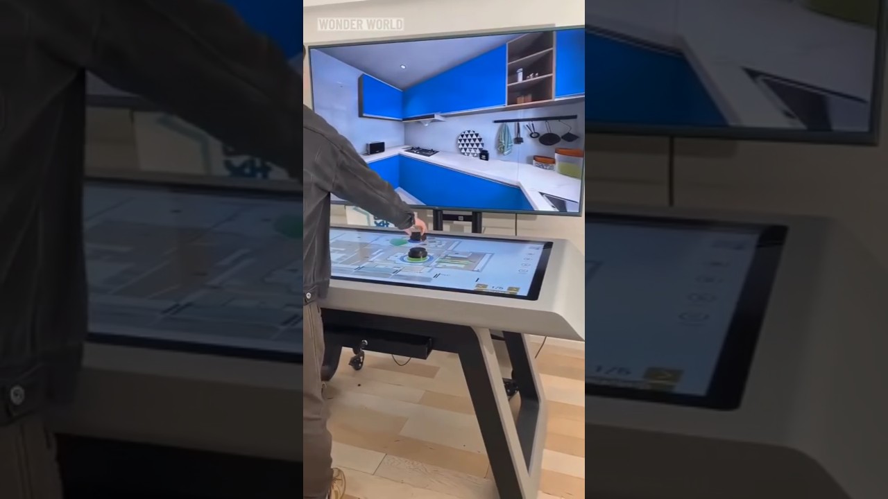 This interactive system allows users to experiment with different layouts, furniture, and materials in real-time. On the touch table below, a 2D floor plan comes to life, and users can control it using either simple touch gestures or physical dials.