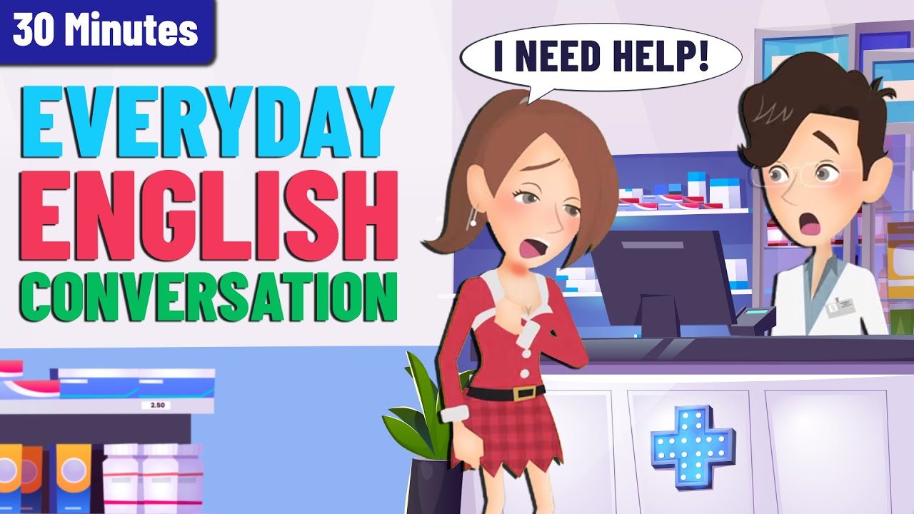 Practice english speaking practice with short and fun dialogues in the pharmacy, café, office, and street.