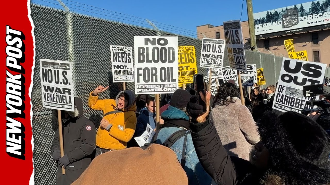 Protesters gathered outside the Metropolitan Detention Center in Brooklyn, where Venezuelan President Nicolás Maduro is being held following his seizure from Caracas. Demonstrators held signs and chanted slogans such as "No, no blood for oil, hands off Venezuela's soil" and "Up up with liberation, down down with occupation."
